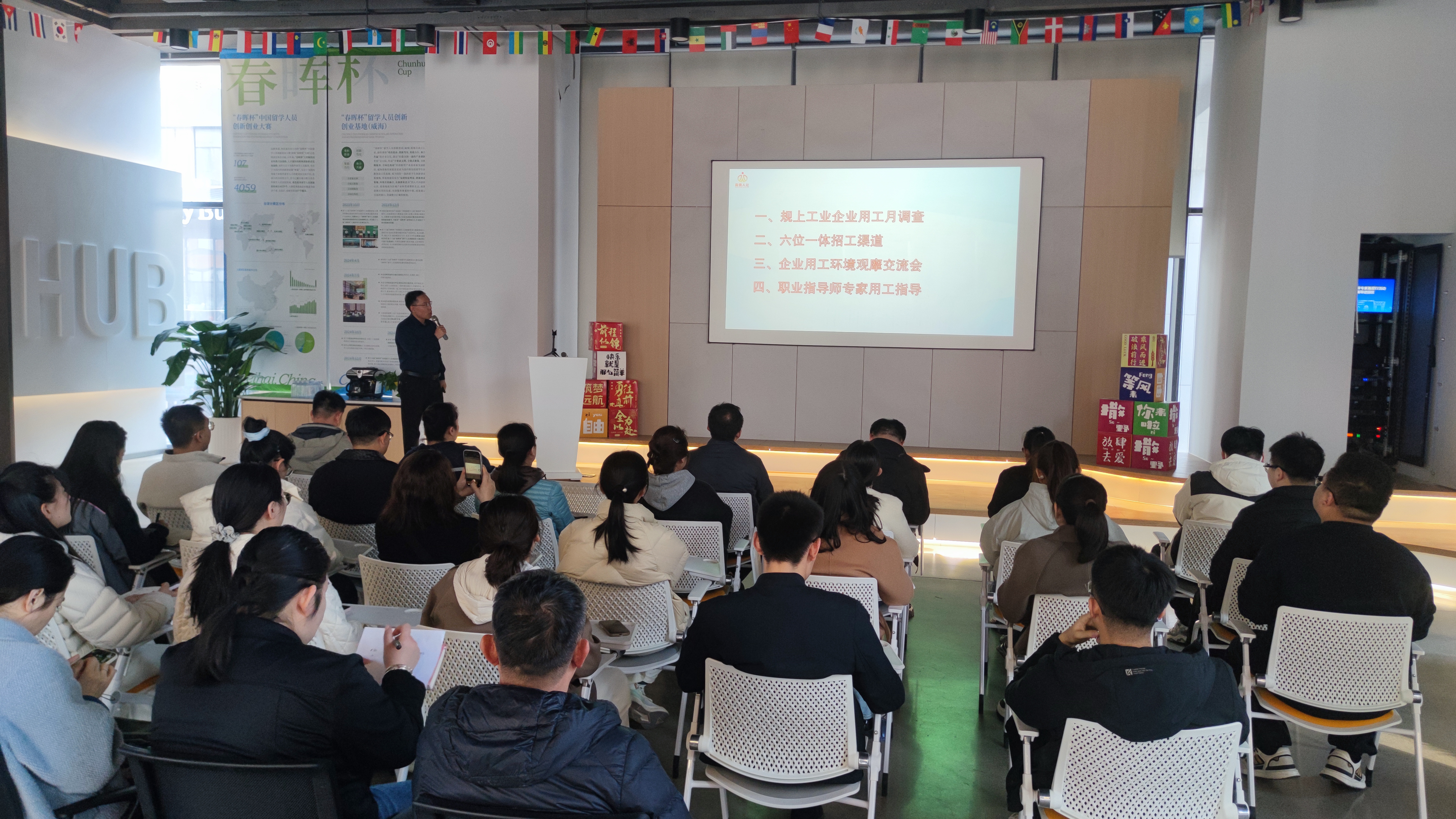 为确保本次活动取得实效,市人社局提前开展了企业诉求摸排工作,围绕招工引才、员工留存、规范用工等方面梳理现实需求,并逐一建立问题清单,为精准服务打下基础。 本次活动特邀省、市两级职业指导专家团成员现场授课,在威海国际人才港会客厅开展沉浸式、专业化用工指导,全方位为企业用工提质增效保驾护航。 活动伊始,日月新半导体公司相关负责人现场分享招工留工先进经验,为参会企业提供可借鉴、可复制的实践案例。 随后,多位职业指导专家聚焦企业核心诉求,开展专题授课辅导。市人社局职业指导师赵文智围绕企业用工服务保障机制展开解读,手把手指导企业优化招聘策略、拓宽招工渠道,全面提升招工覆盖面和精准度;省职业指导师专家库成员张磊深入剖析企业“招、育、留、用”全流程策略,引导企业树立打造雇主品牌,激活人才发展引擎的科学用工理念,深刻认识完善人才培育与留存机制对稳定员工队伍的关键作用;市职业指导师专家团成员、市劳动人事争议仲裁院仲裁庭长张明从规范用工管理、筑牢劳动关系、优化用工环境等角度,为企业防范用工风险、稳定员工队伍提供专业指引。